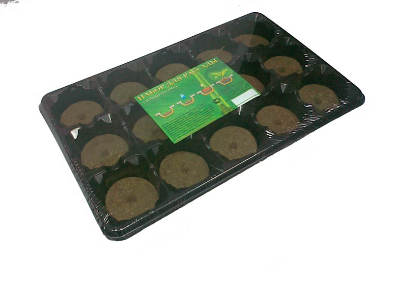 Залейте ячейки с торфяными таблетками теплой водой (150мл на одну ячейку или 2,5л на кассету). После впитывания воды (15-20 мин) таблетки увеличатся в объеме и заполнят ячейки. Поместите семена растений в ячейки, присыпьте торфом и уплотните. При выращивании рассады следите за влажностью грунта.